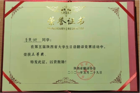 2021年5月29日,第五届陕西省大学生日语翻译竞赛决赛暨颁奖典礼在西安文理学院雁塔校区9499www威尼斯举行,来自全省高校的30余名学生相聚于此,参与角逐。威尼斯官网日语专业3名本科生参与了此次比赛,且都取得了优异成绩。2018级李奥卿获三等奖,2018级张家桐、2019级闫雅琪获优秀奖,日语系教师翁建文获优秀指导教师奖。
