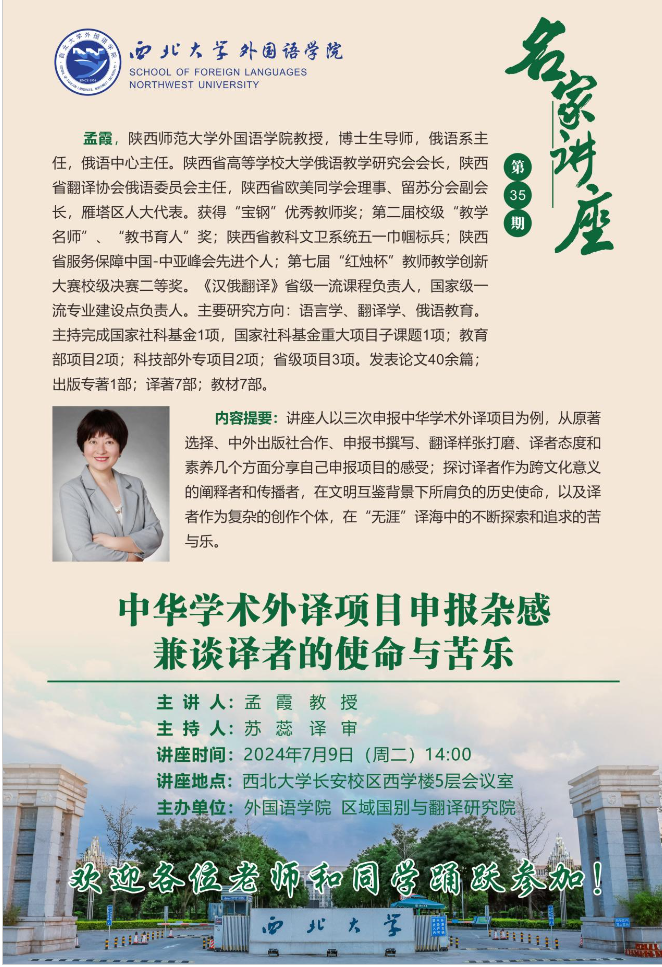 Speaker: Meng Xia, Professor at the School of Foreign Languages, Shaanxi Normal University, PhD Supervisor, Head of the Russian Department, and Director of the Russian Center. She is the President of the Shaanxi Higher Education Research Association for University Russian Language Teaching, Director of the Russian Committee of the Shaanxi Translators Association, Board Member of the Shaanxi Overseas Students Association, and Vice President of its Soviet Union Branch, as well as a People’s Representative for Yanta district, Xi’an city. Professor Meng has received the “Bao Gang” Outstanding Teacher Award, the second university-level “Teaching Excellence” and “Educator” Awards, and was recognized as a Model Worker during the May 1st Labor Day by the Shaanxi Provincial Education, Science, Culture and Health System. Professor Meng was also honored for her contributions to the China-Central Asia Summit and achieved second place in the university finals of the 7th “Red Candle Cup” Teaching Innovation Competition. She leads the provincial-level first-class course “Chinese-Russian Translation” and manages a national-level first-class program development project. Her main research areas include linguistics, translation studies and Russian education. Professor Meng has led and completed one National Social Science Fund project, one sub-project of a major National Social Science Fund project, two Ministry of Education projects, two projects from the Ministry of Science and Technology for foreign experts, and three provincial projects. She has published over 40 papers, authored one monograph, translated seven works and contributed to seven textbooks.