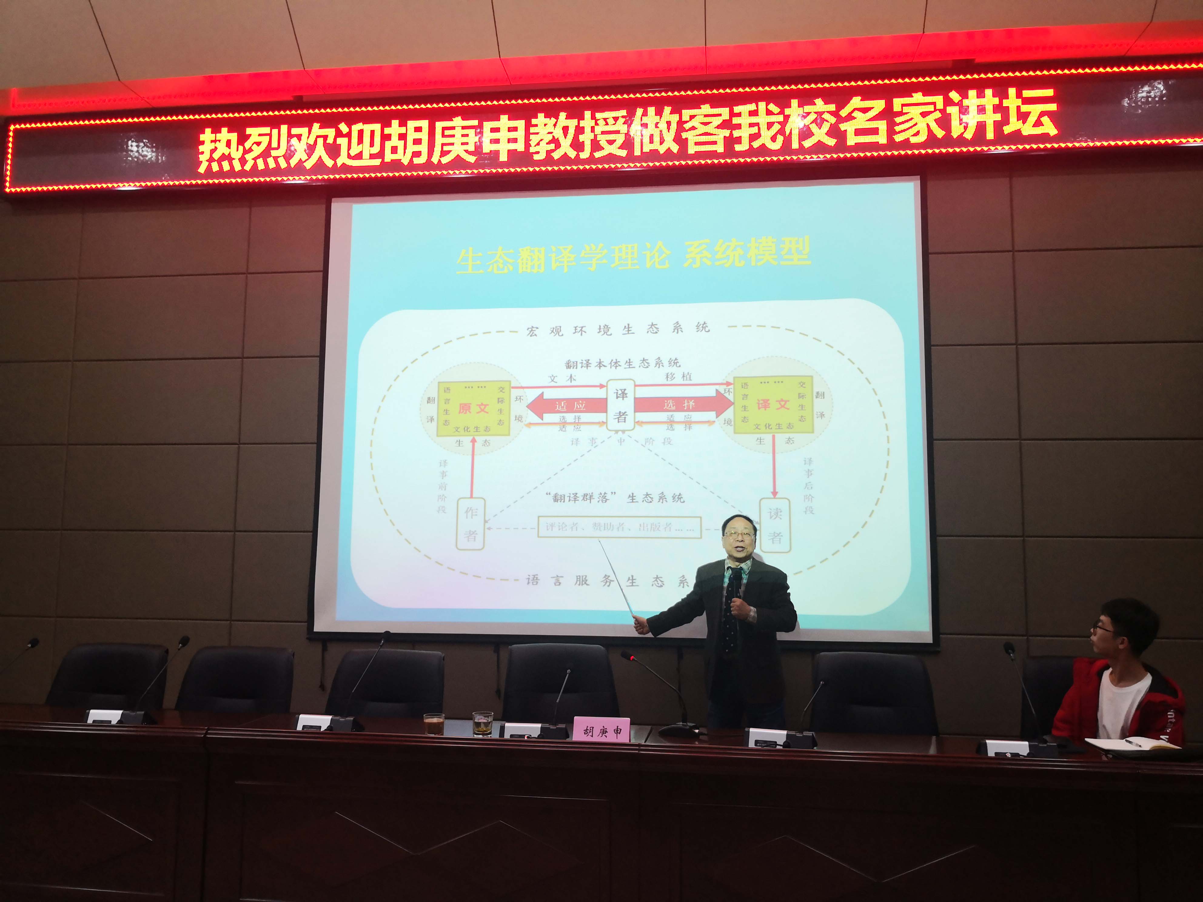 11月13日下午,清华大学二级教授、郑州大学生态翻译学研究院院长、外国语与国际关系学院特聘教授、博士生导师胡庚申教授应邀做客威尼斯官网名家讲坛,为师生作了题为“生态翻译学:理论创新与国际发展”的主题报告。报告由9499www威尼斯院长胡宗锋教授主持,数百名师生参会。