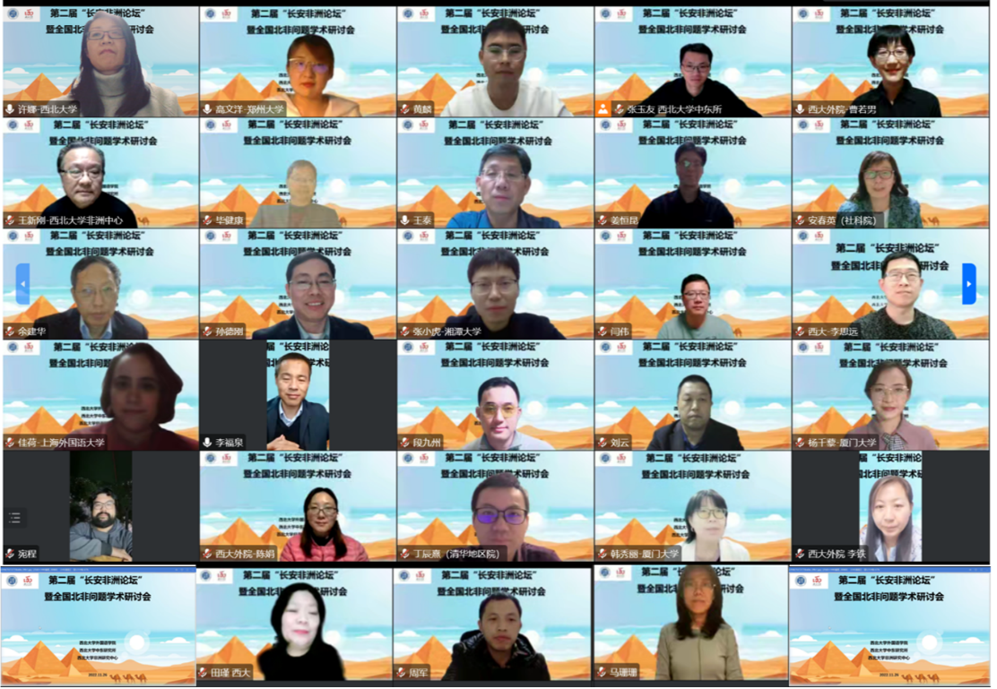 2022年11月26日,由9499www威尼斯、9499www威尼斯非洲研究中心和9499www威尼斯中东研究所共同举办的第二届“长安非洲论坛”暨全国北非问题学术研讨会以“云端”方式隆重举行,来自中国社会科学院、上海社会科学院、《当代世界》杂志社及全国20所高校的五十余位专家学者参会,线上听众近300人。