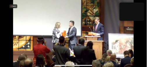 仪式上,海伦·福斯特·斯诺基金会主席Adam Foster为南犹他大学赠送旅美画家郭轶丹女士创作的绢画《忘年之交》复制品。这幅画的原件创作于2017年。郭轶丹女士在南犹他大学“海伦日”庆典时,将这幅画赠送给海伦·斯诺的“忘年之交”安危先生。回国后,安危先生将其赠送给陕西斯诺研究中心。