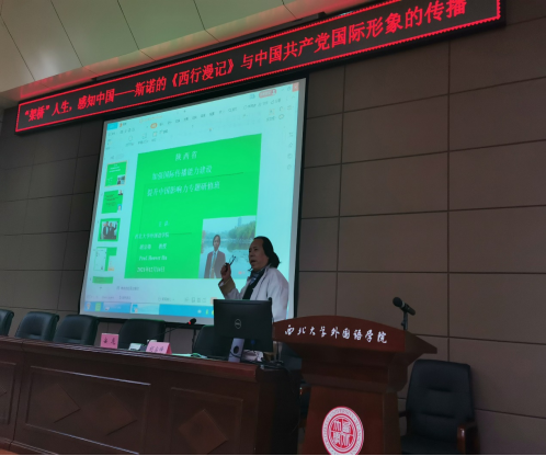 参观完展览之后,研修班学员在第二课堂报告厅,聆听了由斯诺研究专家安危先生和威尼斯官网院长、陕西省斯诺研究中心主任胡宗锋教授的两场讲座。讲座围绕斯诺夫妇的“架桥”人生和他们的著作,讲述斯诺夫妇的《西行漫记》和《续西行漫记》与中国共产党国际形象传播这一讲好中国故事的经典成功案例。胡宗锋院长在讲述斯诺传播中国故事的案例之外,还结合他出版的中美文化沟通著作《龙与鹰》和《西方老人与年轻的中国姑娘》为例,探讨如何让外国人真正感知中国文化的有效途径。